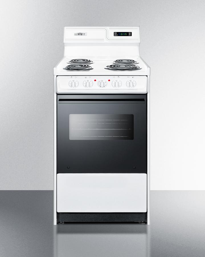 Summit Appliance offers a wide selection of American-made household ranges built for long-lasting durability in space-challenged kitchens. The 23.2 amp design is ideal for kitchens with power limitations. The WEM130DK is an apartment-sized 220V electric range sized at just 20" wide, with a generous 2.46 cu.ft oven interior that can accommodate large trays. The black glass oven window and interior light with an on/off switch make it easy to monitor your cooking without opening the door. Two adjustable oven racks are included. The waist-high broiler is located inside the oven, allowing you to switch functions without moving contents to a separate compartment on the floor. The lower drop-down storage compartment is ideal for keeping pots and pans out of the way in small kitchens. Designed to meet the most current UL safety standards, this unit features one 8" 950W and three 6" 650W coil elements. These operate at lower wattage than standard electric ranges, allowing for a slow but steady heating process that will not cycle off. Upfront push-to-turn knobs offer additional protection, ensuring users won't reach over hot burners to adjust the heat. This unit complies with ADA guidelines. The WEM130DK comes in a classic white finish to suit any kitchen. It has a recessed oven door and is conveniently sized at just 24" deep for a better fit in galley in L-shaped kitchens, where every inch counts. Porcelain and steel construction help the unit hold up to years of daily use. We include an anti-tip bracket for added safety. This unit does not include a line cord (a standard 25 or 30 amp 3 or 4-wire range cord can be installed by your electrician). With its classic style and quality construction, Summit's made in the USA cooking line offers reliable cooking for smaller homes. Additional choices are available in 24", 30", and 36" wide fits.