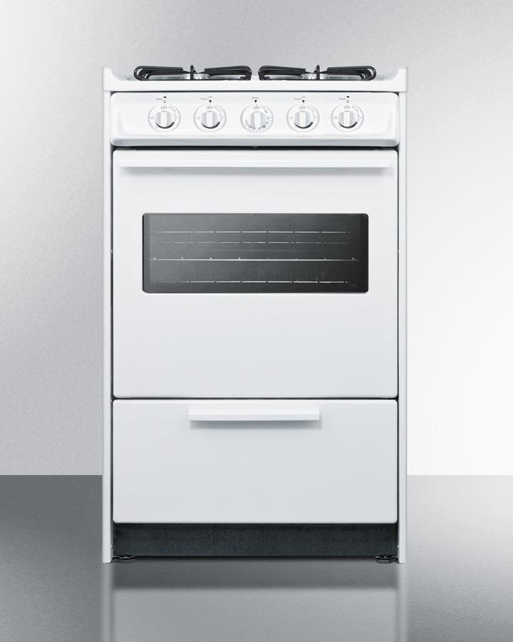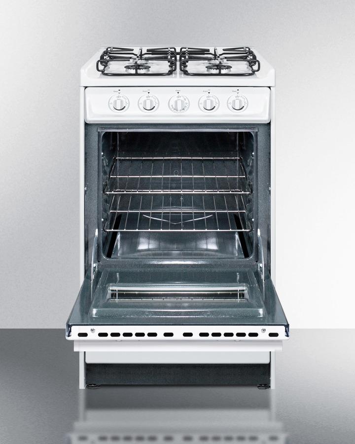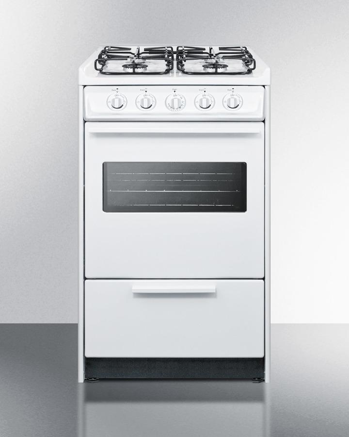 SUMMIT offers a wide selection of American-made household ranges built for long-lasting durability in space-challenged kitchens. The WTM1107RSW is an apartment-sized gas range sized at just 20" wide, with a generous 2.46 cu.ft oven interior that still can accommodate large trays. The broiler is located below the oven in a drop-down compartment. Four sealed 9100 BTU gas burners offer safer cleaning and cleaner cooking. This unit utilizes an electronic ignition system for added safety. The WTM1107SWRT comes in a white finish with an oven window and interior light for easier monitoring of your cooking. The low stainless steel backguard creates a modern slide-in look that is easier to integrate into your own kitchen design. Fully constructed from steel and porcelain, Summit's American-made cooking line offers long-lasting quality for the home. Additional choices are available in 24" and 30" wide fits.