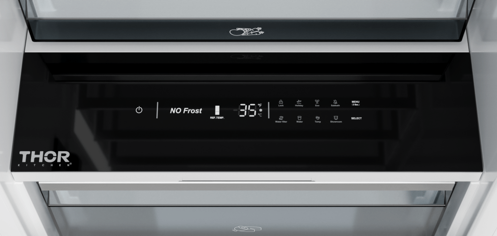 THOR Kitchen offers the power and performance of a premium professional appliance at a practical price. Thor's XRF24CRF Built-in Refrigerator Column delivers advanced performance and sleek design for a superior kitchen experience. Featuring Total No Frost technology, it eliminates ice and moisture build-up to keep your food fresh. The automatic ice maker produces up to 4 lbs. of ice per day, while fast freezing ensures your ingredients maintain their optimal taste and quality. Bright interior LED lighting provides clear visibility, and soft-close drawers add a touch of luxury. Operating at an ultra-quiet 43 dB(A), it ensures a peaceful kitchen environment. With a wide temperature range from +5(degree)F (-15(degree)C) to -11(degree)F (-24(degree)C) and versatile modes such as Sabbath, Holiday, and ECO."