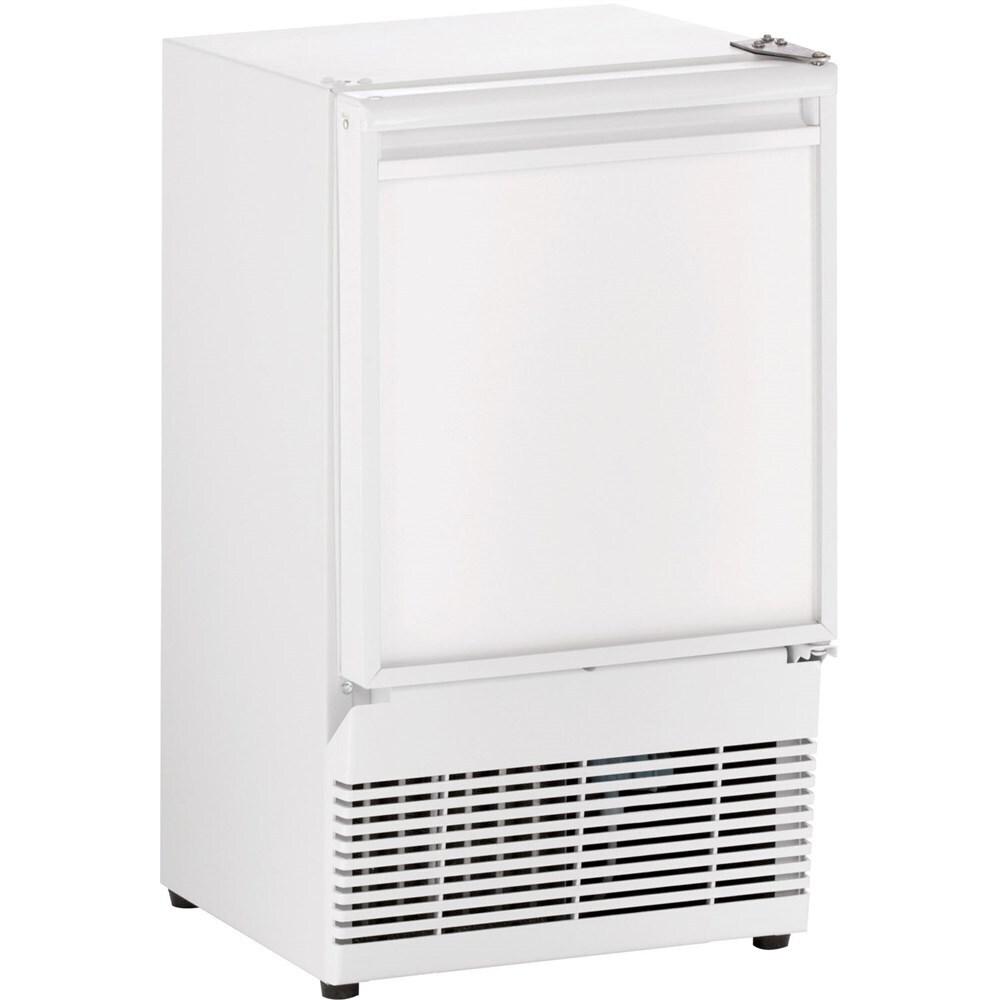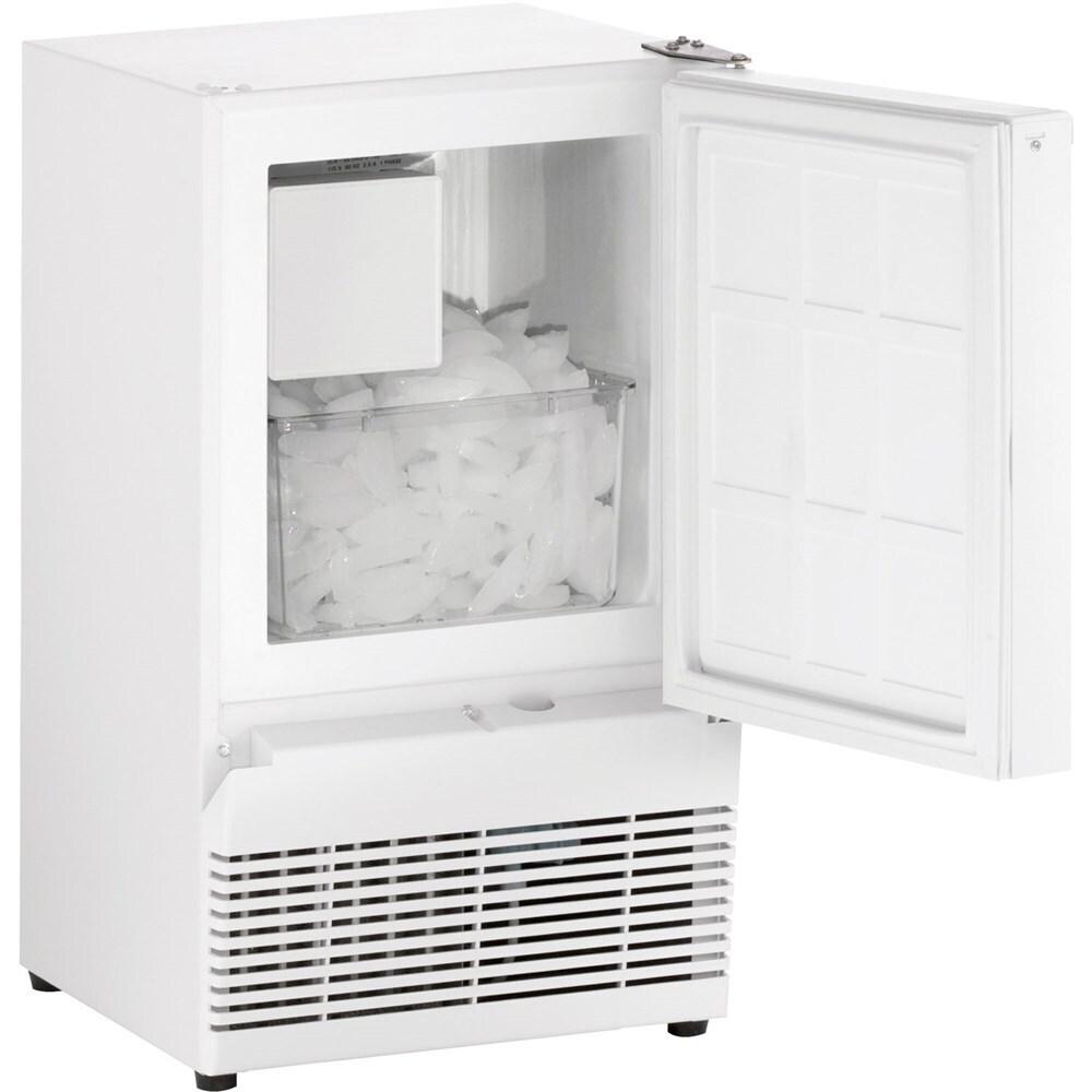The U-Line U-BI95W-00A 14-In. ADA Series White Field-Reversible Crescent Ice Maker produces up to 23 pounds of crescent ice per day with less than 3 gallons of water. It holds up to 12 pounds of ice. The daily ice production rate is approximately 4 times greater than the average household refrigerator. Manual defrost; no drain required. The unit is designed to be built in or free standing.