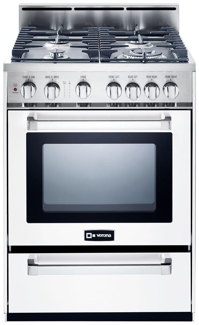 Verona gives you all of the power of a full size professional range for a small space kitchen. The 24 inch Gas range offers a versatile selection of both high and low power sealed burners that will handle any cooking chore. The turbo electric convection fan provides even heat throughout the oven cavity and will bake foods up to 25 percent faster than a conventional oven.