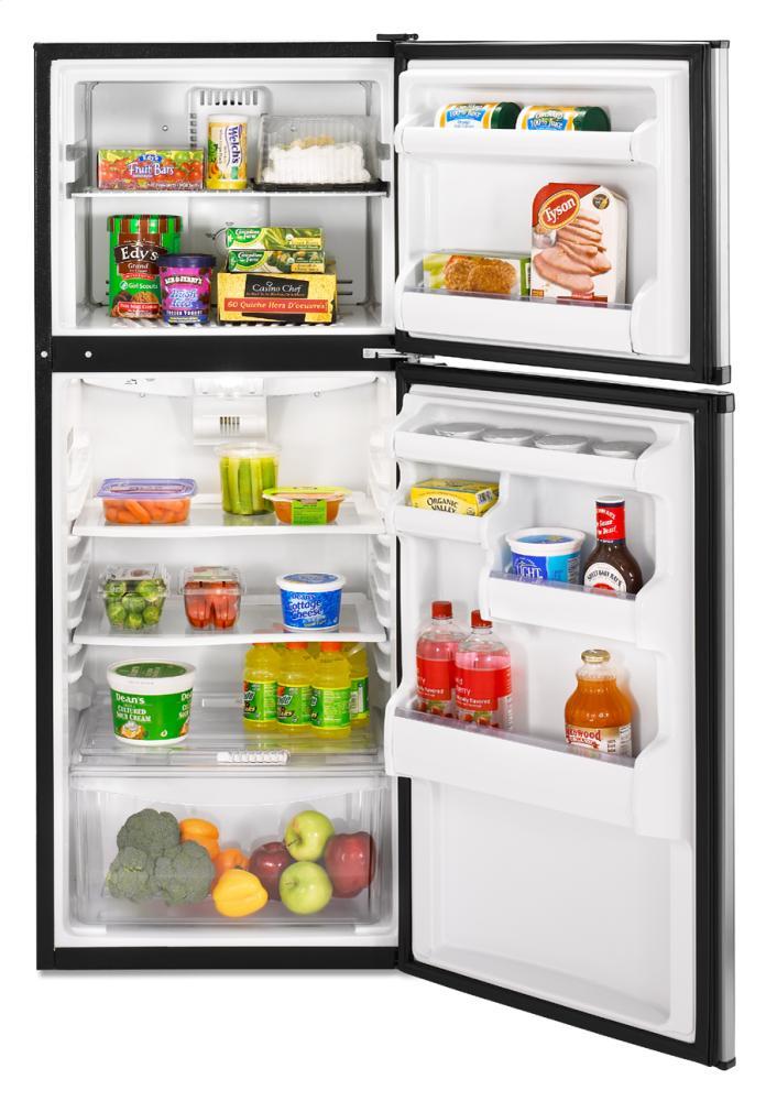 Get the basics you want without the frills you don't. This 10 cu. ft. refrigerator with top freezer fits where you want it to and works hard to please. Reach, store, and see a wide array of fruits and vegetables in the clear, full-width crisper. Help contain messy leaks and spills for easier cleanup with the SpillMizer™ glass shelves. Save time and effort with the Automatic Defrost system that melts away frost so you don't have to take everything out of the freezer to melt built-up ice. With integrated handles to keep the exterior sleek, this refrigerator's modern styling and convenient features are both yours.