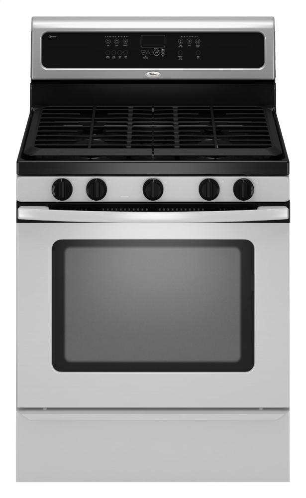 Bring the heat. Our most powerful 17,000 BTU Power™ burner is just one of the five burners on this cooktop. It also features a 15,500 BTU Power™ burner and an AccuSimmer® burner, which great for simmering sauces at low heat. And the full-width, satin-finish, cast-iron grates make it easy to move pots around. This Whirlpool Gold® freestanding gas range with TimeSavor™ Plus true convection cooking system distributes heated air more evenly and helps seal in flavor. Plus, the AccuBake® temperature management system enabled by 6th Sense™ technology uses a sensor to monitor oven temperature to deliver consistent results, even on multiple racks. When your meal's over, the Precise Clean™ system suggests just the right self-cleaning cycle time.