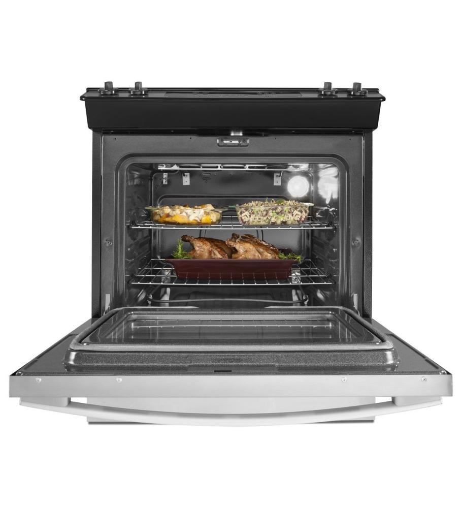 Cook with confidence. This 4.5 cu. ft. range offers the AccuBake® temperature management system uses a sensor to monitor oven temperature to deliver consistent results, while the adjustable split rack gives you options inside the oven. After dinner, the Precise Clean self-cleaning system eliminates the need for harsh cleansers while cleaning the oven on your schedule. There's nothing you can't do with your cooking.