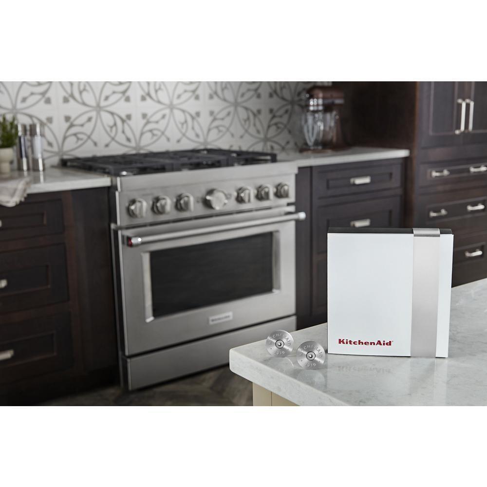 - Package contains (1) KitchenAid® Commercial-Style Range Handle Medallion Kit, Silver