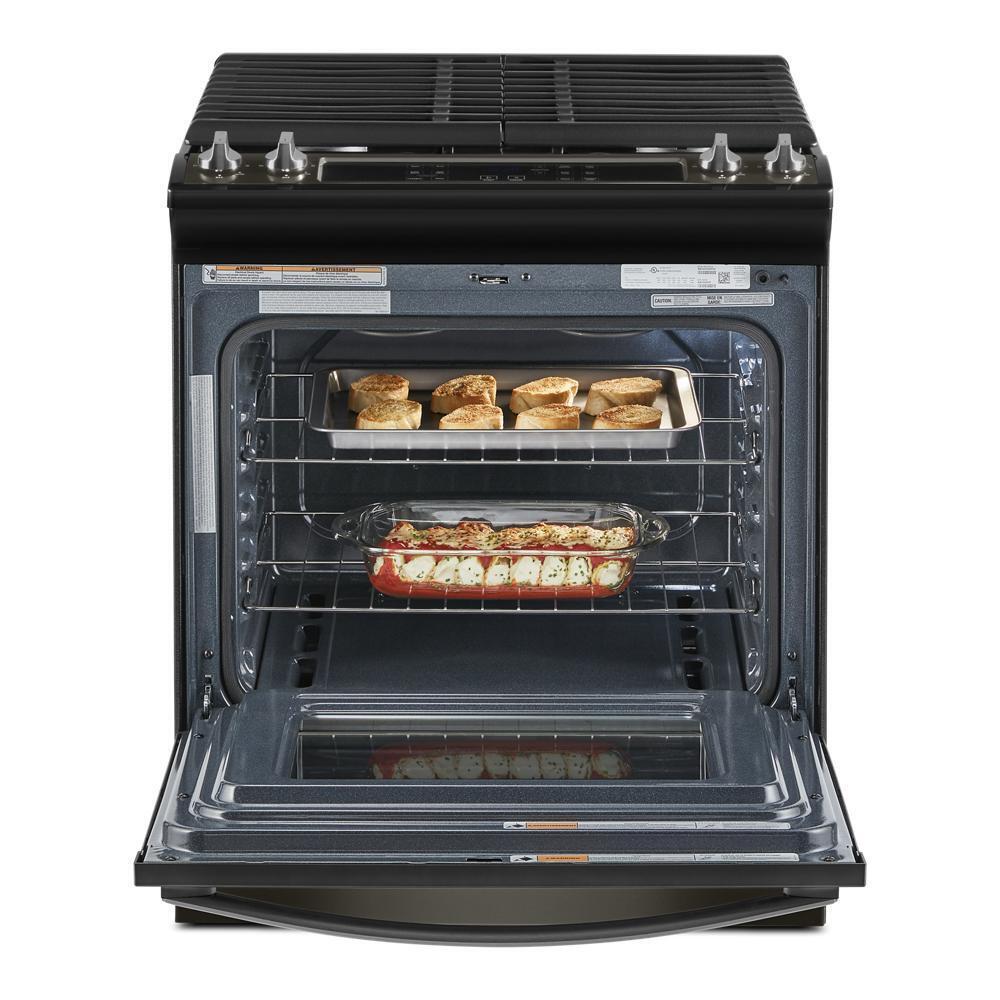 Simplify steps in the cooking process with this gas slide in range that lets you skip preheating for frozen favorites with Frozen Bake™ Technology. Get more flexibility on the cooktop with two high heat burners and edge-to-edge cast iron stove grates. This range is also equipped with a high-temperature, adjustable self clean oven cycle so you can clean without using chemicals.