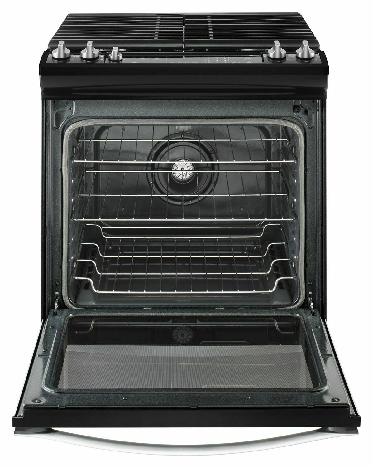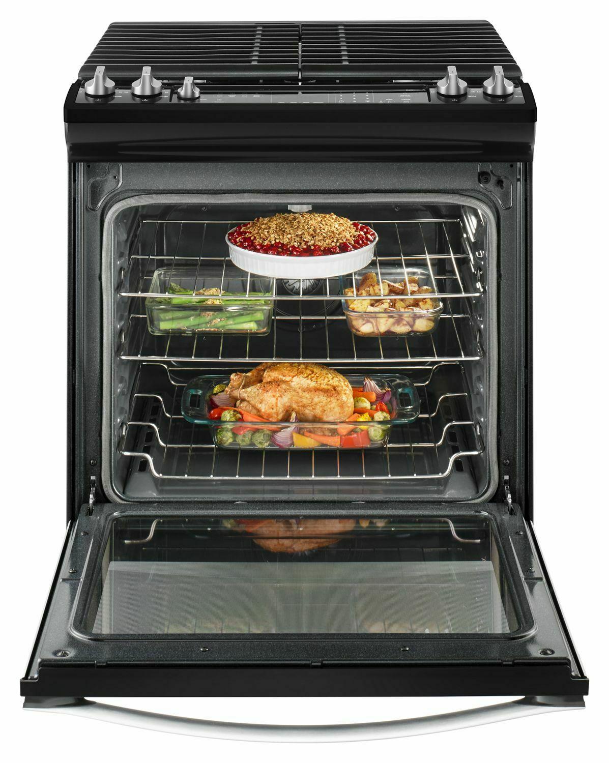 Take on family favorites with this slide-in gas range designed to fit your kitchen and your cooking. Frozen Bake™ technology lets you skip preheating the oven range for frozen dishes like pizza, lasagna, chicken nuggets, fries or pies. Cook food faster with this kitchen range's true convection cooking. Large griddles and other longer cookware heat evenly on the range stove with the center oval burner. And when it's time to clean up, EZ-2-Lift™ hinged cast-iron grates provide quick access to wipe up spills on the kitchen range's cooktop.
