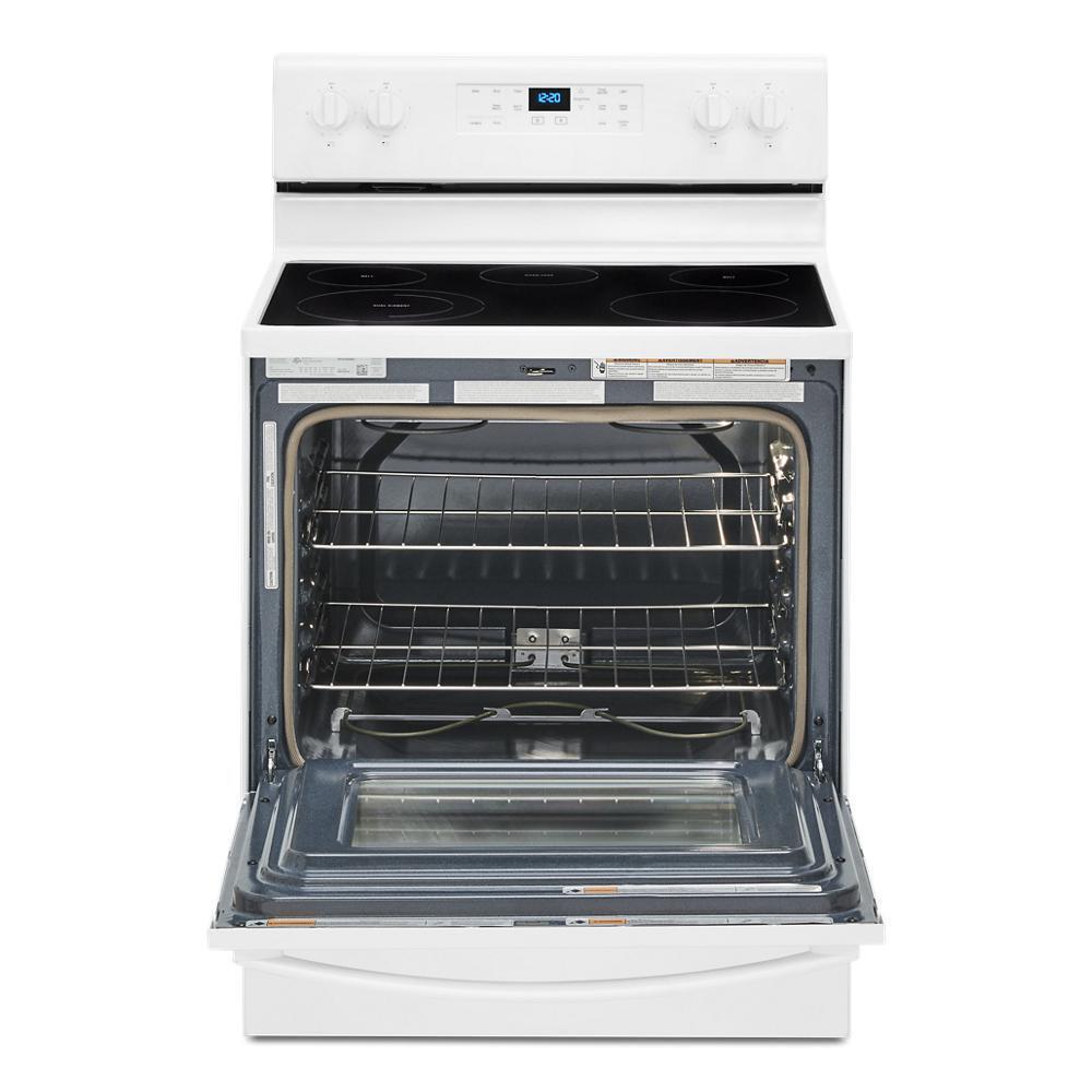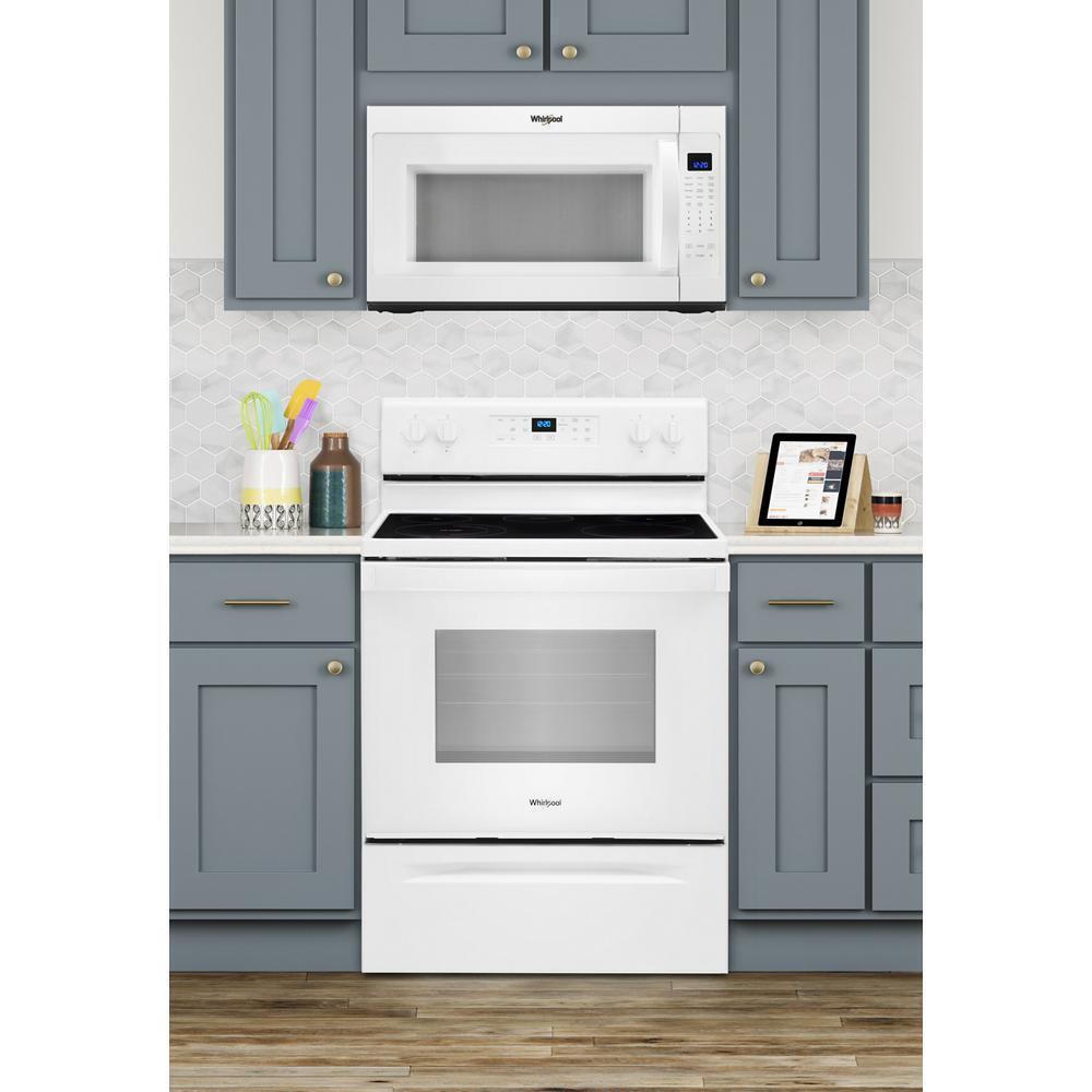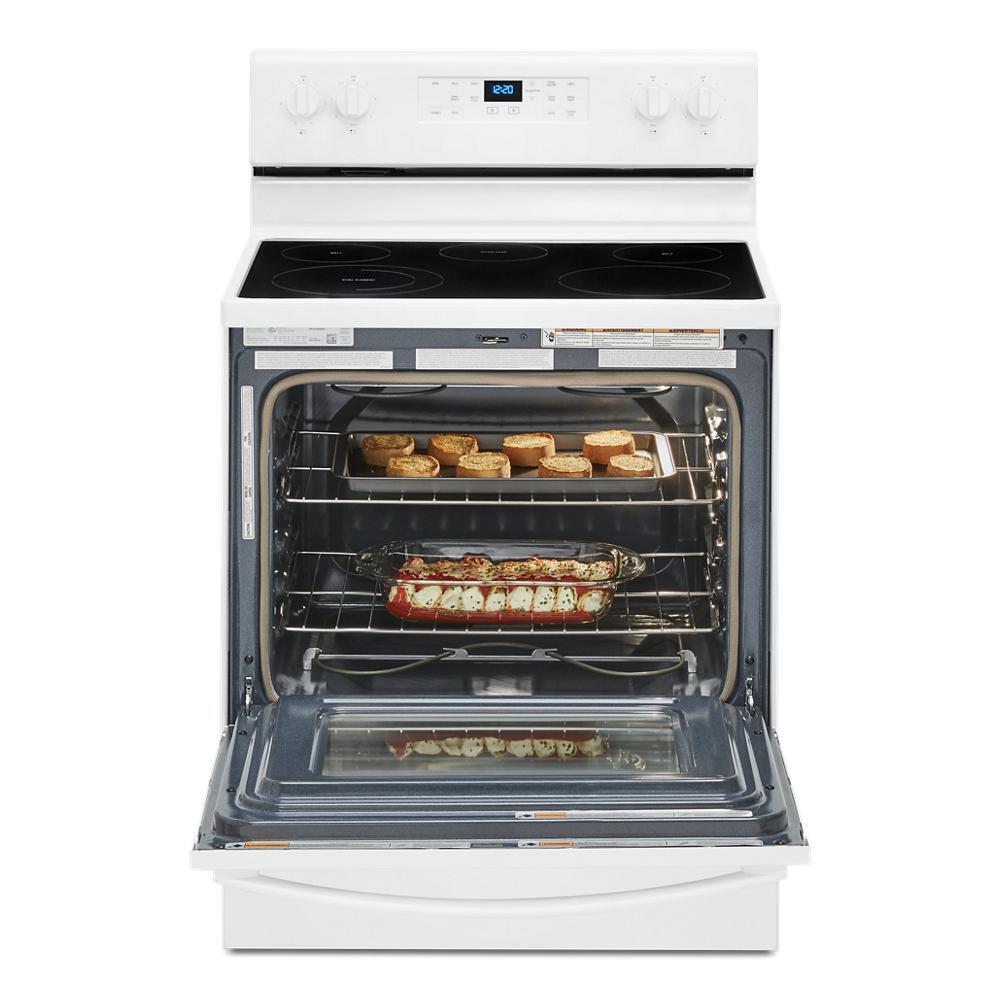 This Whirlpool® electric range with a dual element stove top helps you get dinner to the table. This fingerprint resistant range allows you to skip preheating for favorites like pizza with Frozen Bake™ technology. This self cleaning oven also prevents cooked food from getting cold with a Warm Zone on the cooktop and the Keep Warm setting in the oven.
