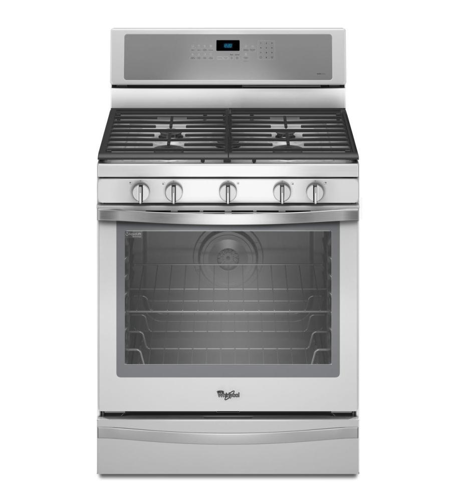 Bake, broil, simmer and saute with Whirlpool brand's largest capacity freestanding gas range. True convection cooking uses a rear fan and a third heating element to circulate hot air and cook food faster inside the oven, while the cooktop offers a variety of flexible cooking options. This 5.8 cu. ft. counter depth gas range's center burner creates space to cook up to five dishes at once, a 17,000-BTU SpeedHeat™ burner quickly boils water and an included griddle gives you the perfect place to cook pancakes and hamburgers. And at the end of the meal, this self-cleaning oven's AquaLift® self-cleaning technology delivers odor-free oven cleaning without chemicals in only 50 minutes 1 .