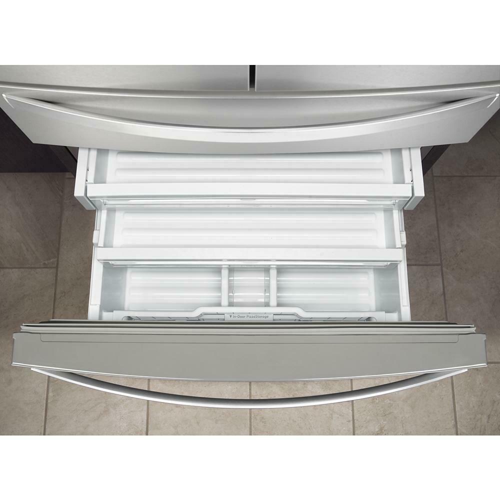 Get flexible storage with purposeful spaces for your family's favorites. This bottom freezer refrigerator features a refrigerated exterior drawer so you can adjust the temperature based on what you're storing. Keep various fruits and vegetables in the trip